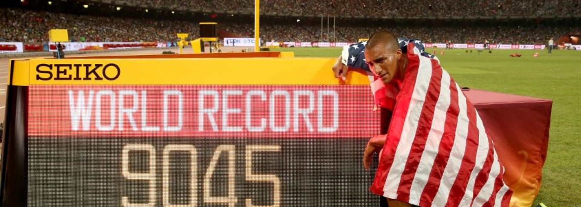 Ashton Eaton with his decathlon world record figures at the IAAF World Championships, Beijing 2015 (© Getty Images)