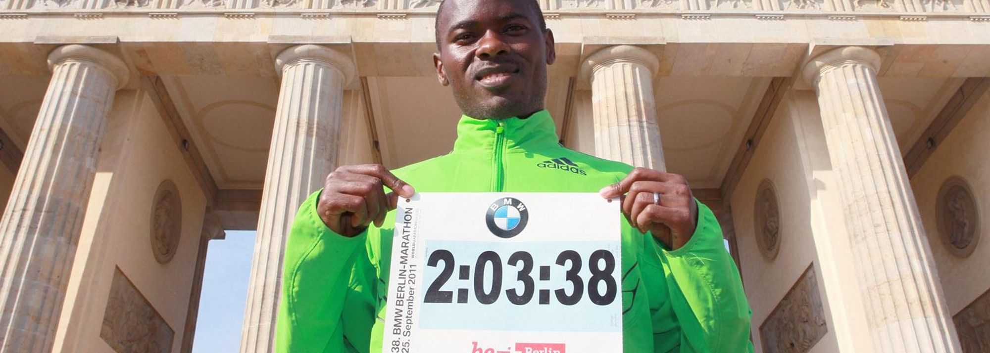 Patrick Makau and his World record numbers at Berlin's Brandenburg Gate (© Victah Sailer)