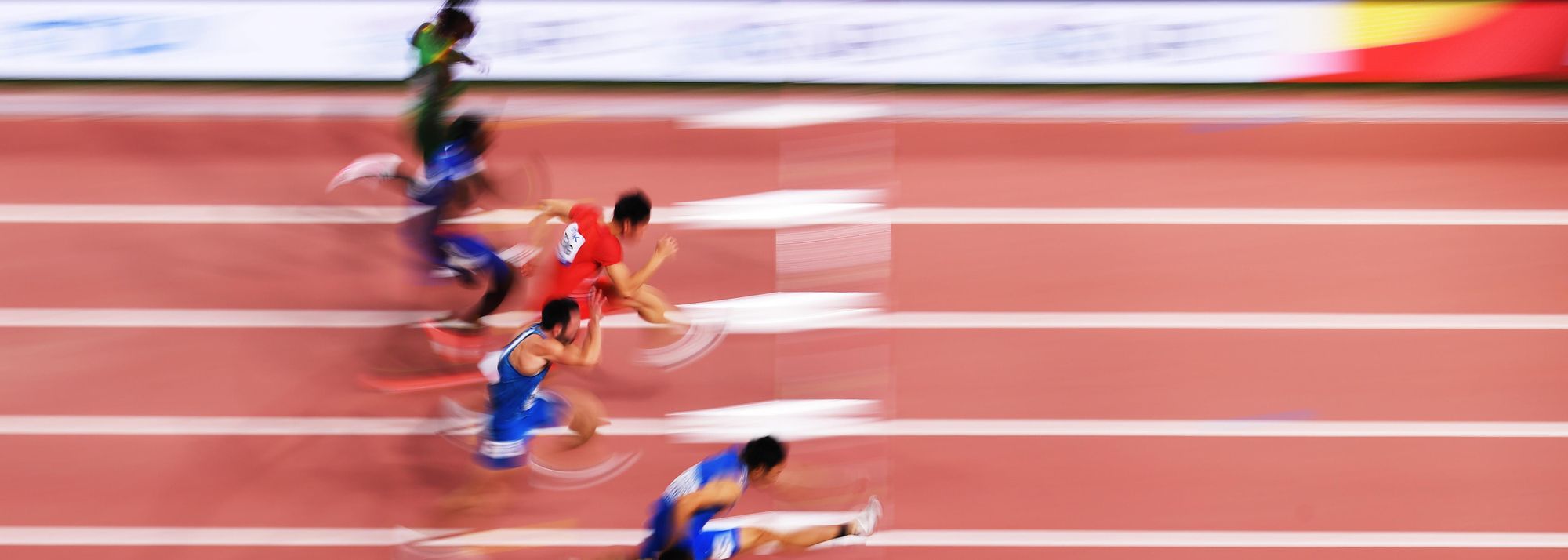 Athletes in action in the 110m hurdles at the IAAF World Athletics Championships Doha 2019 (© Getty Images)