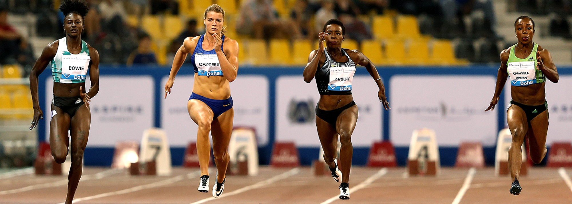 Tori Bowie (left) on her way to winning the 100m at the IAAF Diamond League meeting in Doha (© Getty Images)