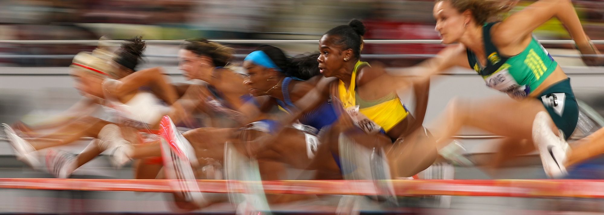 Athletes in action in the 100m hurdles at the World Athletics Championships Doha 2019 (© Getty Images)