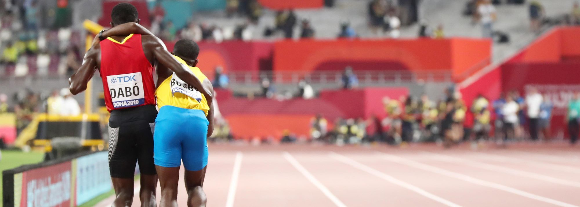 Braima Suncar Dabo helps Jonathan Busby to the finish of the their heat in the 5000m at the World Athletics Championships Doha 2019 (© Getty Images)