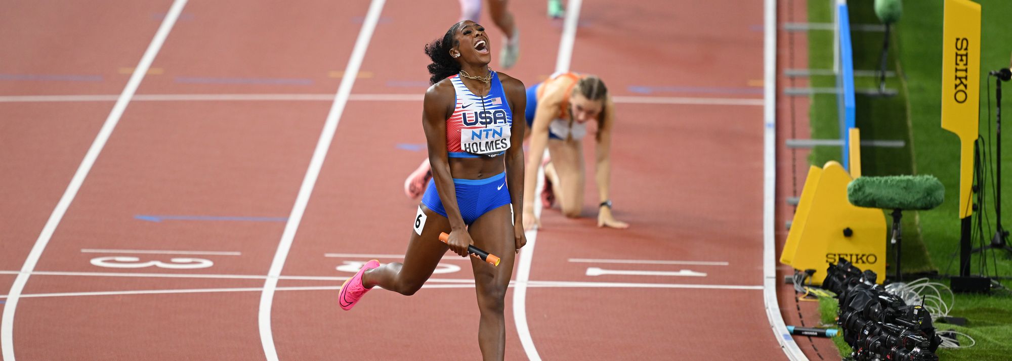 Alexis Holmes celebrates USA's mixed 4x400m world record at the World Athletics Championships Budapest 23 (© Getty Images)