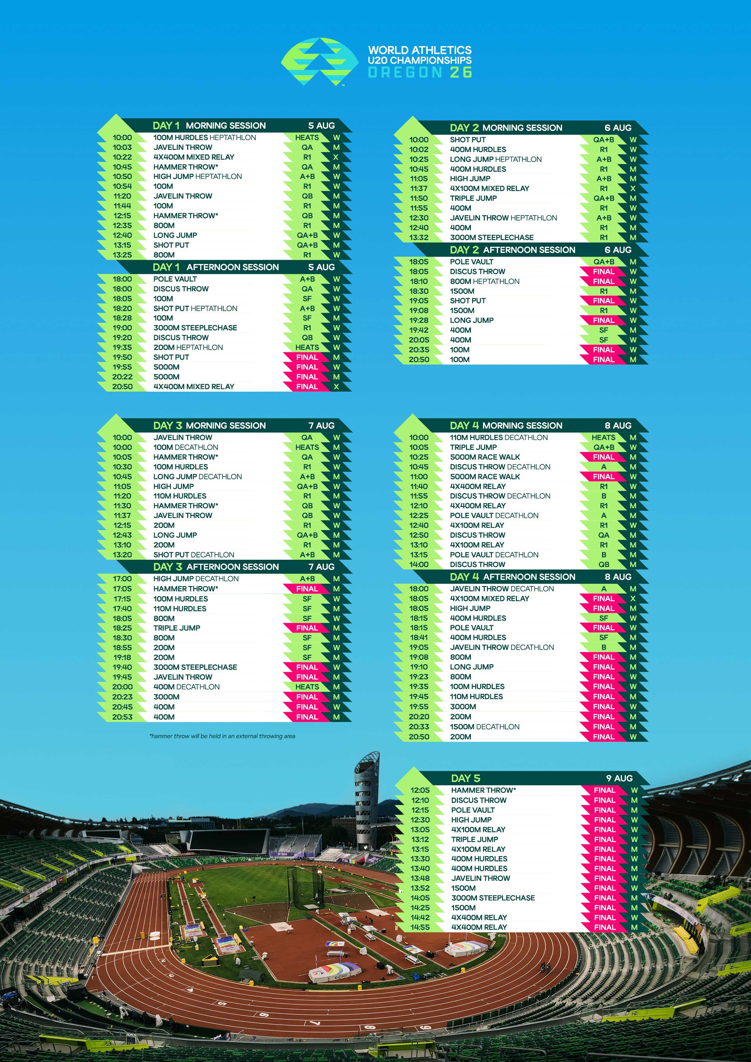 • World Athletics U20 Championships Oregon 26 (5-9 August)