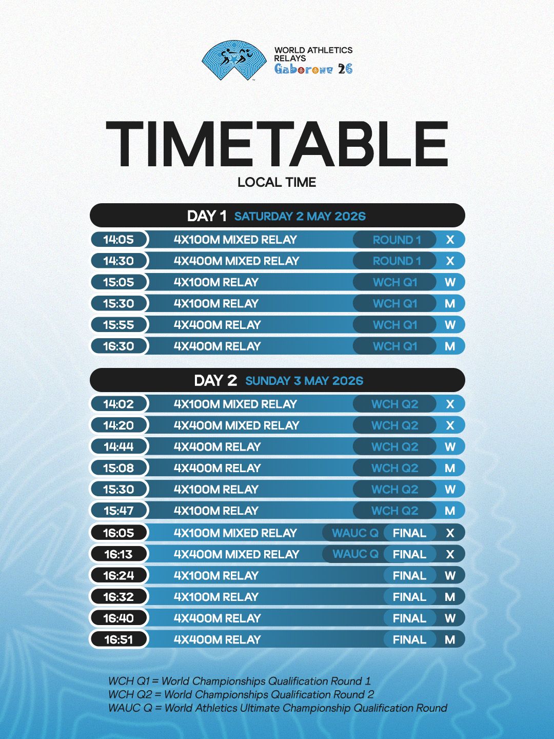 • World Athletics Relays Gaborone 26 (2-3 May)
