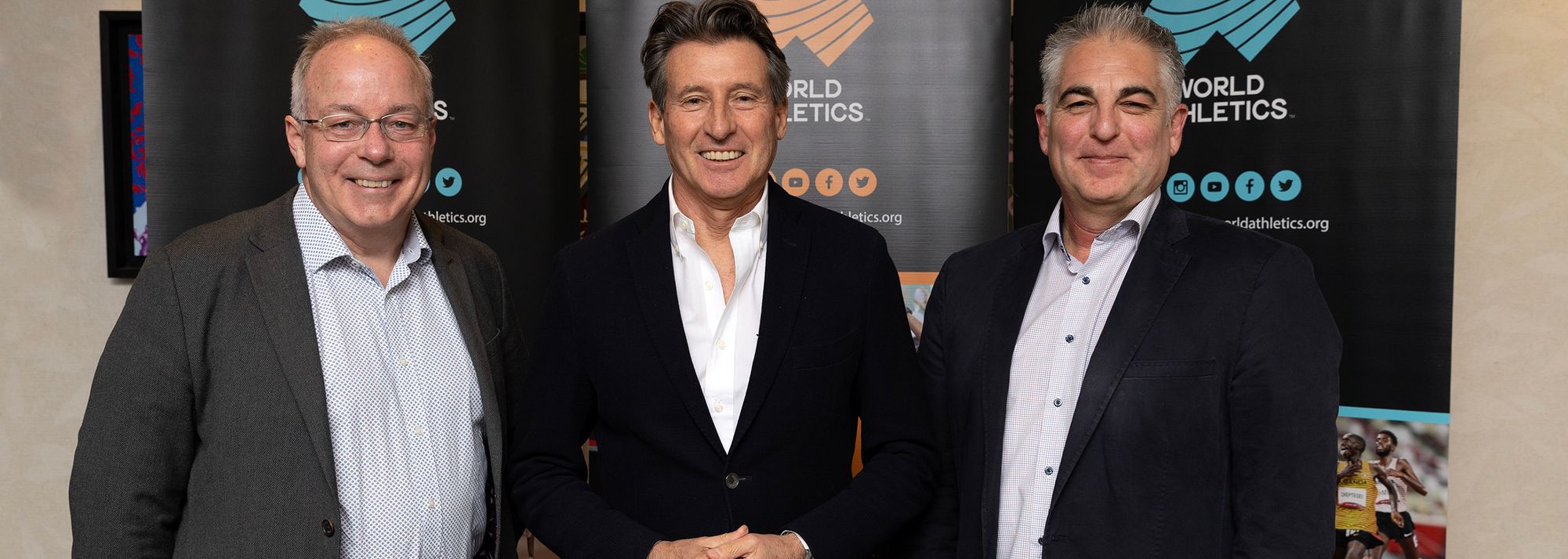 World Athletics President Sebastian Coe with Pinsent Masons representatives Trevor Watkins and Julian Diaz-Rainey (© Giuseppe Fama)