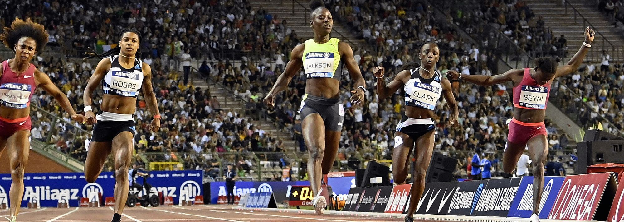 Shericka Jackson pips Shelly-Ann Fraser-Pryce in the 100m at the Wanda Diamond League meeting in Brussels (© AFP / Getty Images)