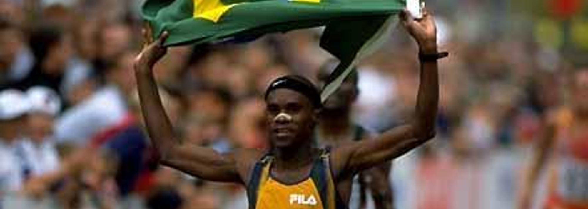 Ronaldo da Costa parades the Brazilian flag at the 1998 World Half Marathon Champs (© Getty Images)