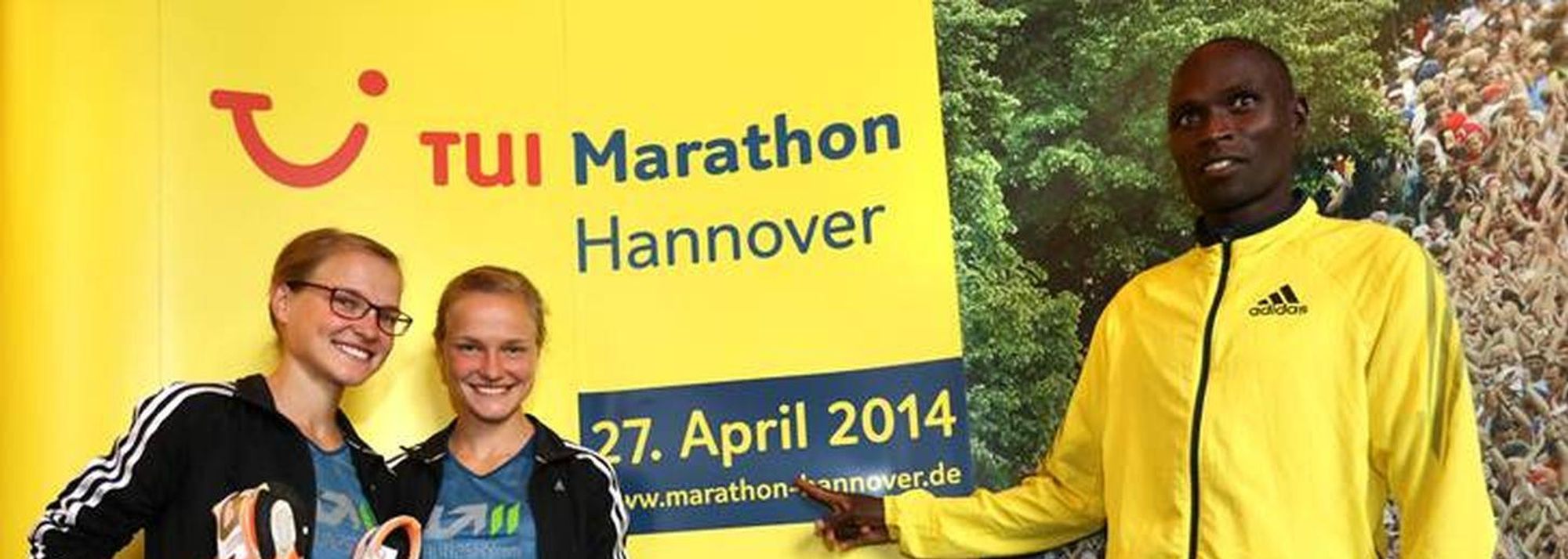 Lisa and Anna Hahner, and Evans Ruto, ahead of the 2014 TUI Marathon Hannover (© TUI Marathon Hannover / Florian Arp)