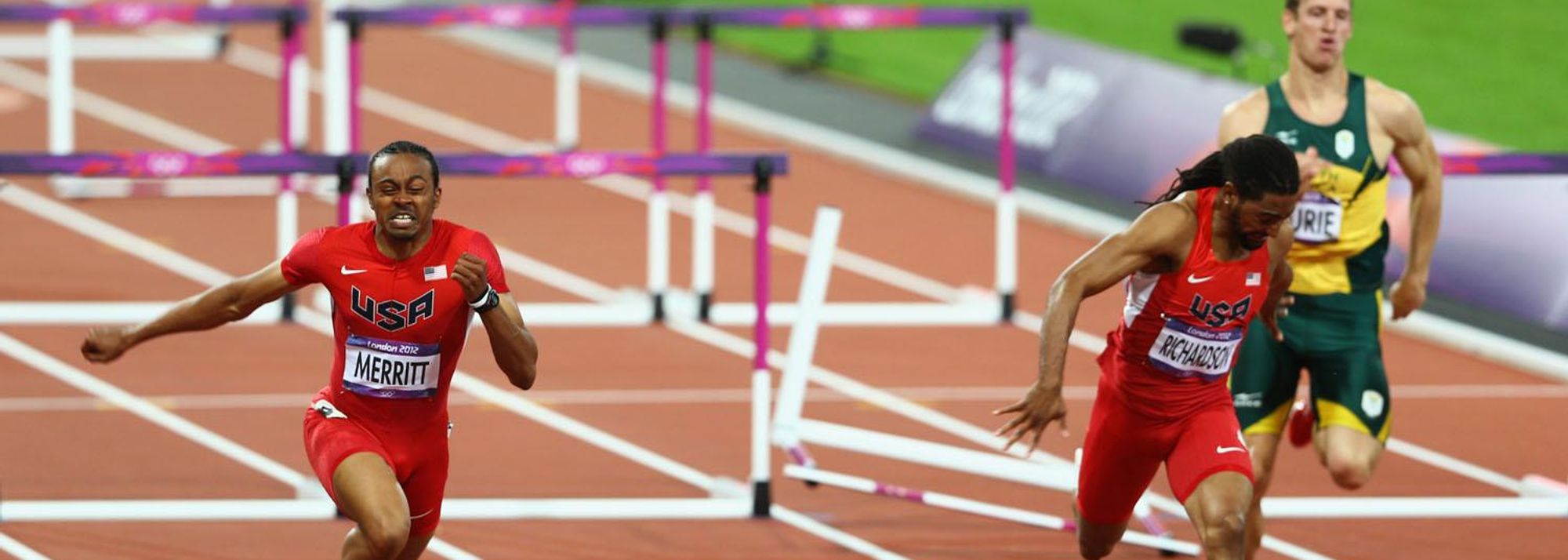 Aries Merritt of the United States crosses the finish line ahead of Jason Richardson of the United States to win gold in the Men's 110m Hurdles Final of the London Olympic Games on August 8, 2012 (© Getty Images)