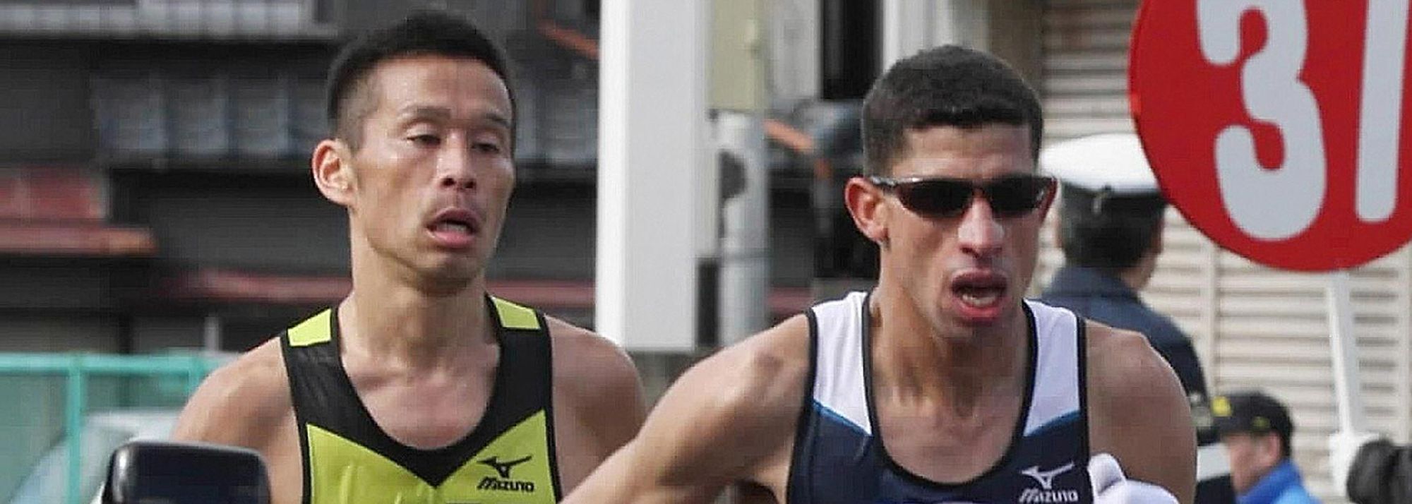 Morocco’s Adil Annani leads Seiji Kobayashi in the 58th Beppu-Oita Marathon (© AFP / Getty Images)