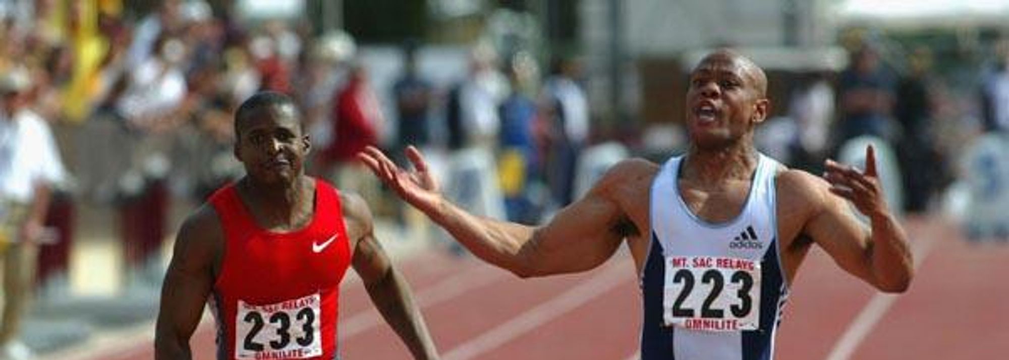 Maurice Greene defeats Tim Montgomery at the Mt SAC Relays (© Getty Images)