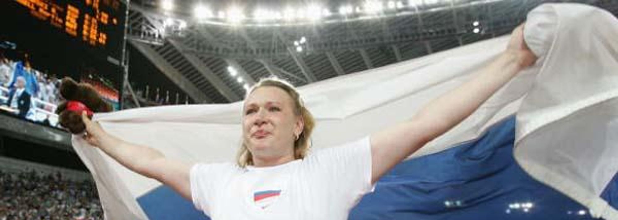 Natalya Sadova celebrates winning gold in the women's Discus Throw (© Getty Images)