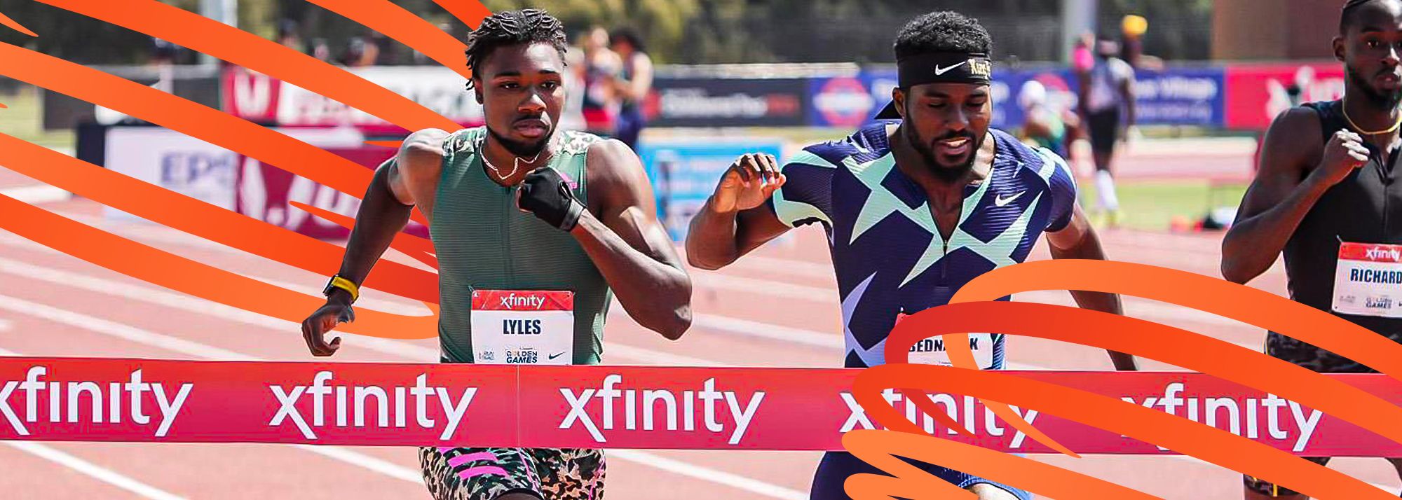 Noah Lyles and Kenny Bednarek at the USATF Golden Games (© Kirby Lee)