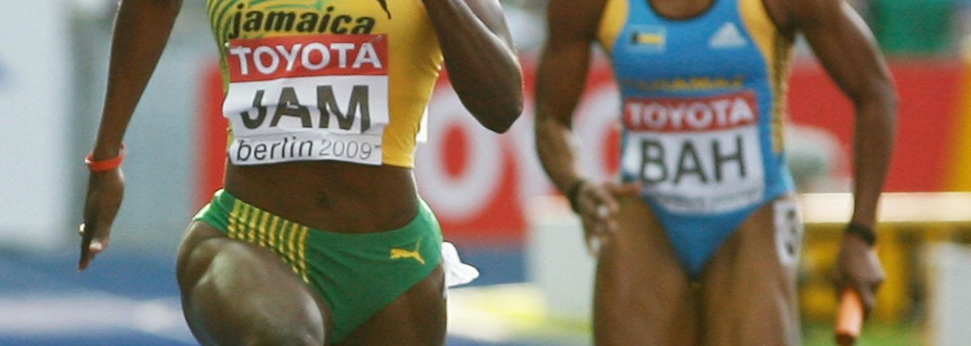 Jamaica's Kerron Stewart in the women's 4x100m relay heats in the Berlin Olympic Stadium (© Getty Images)