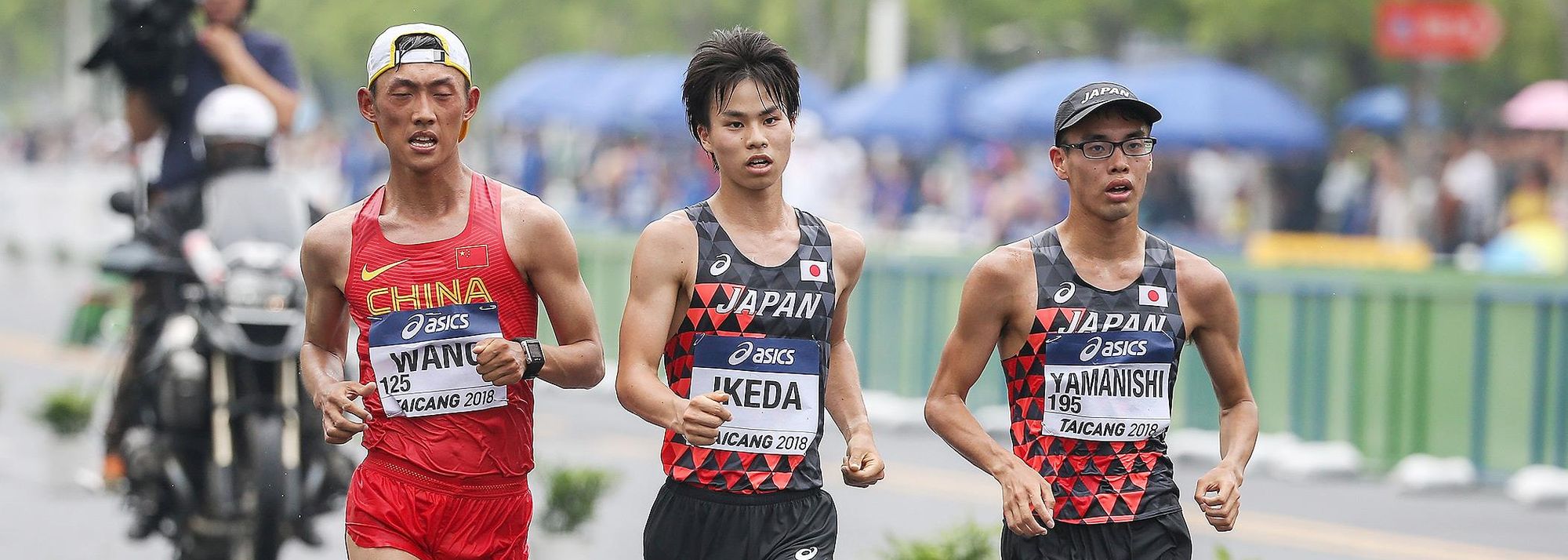 Wang Kaihua, Koki Ikeda and Toshikazu Yamanishi in action at the IAAF World Race Walking Team Championships Taicang 2018 (© Getty Images)
