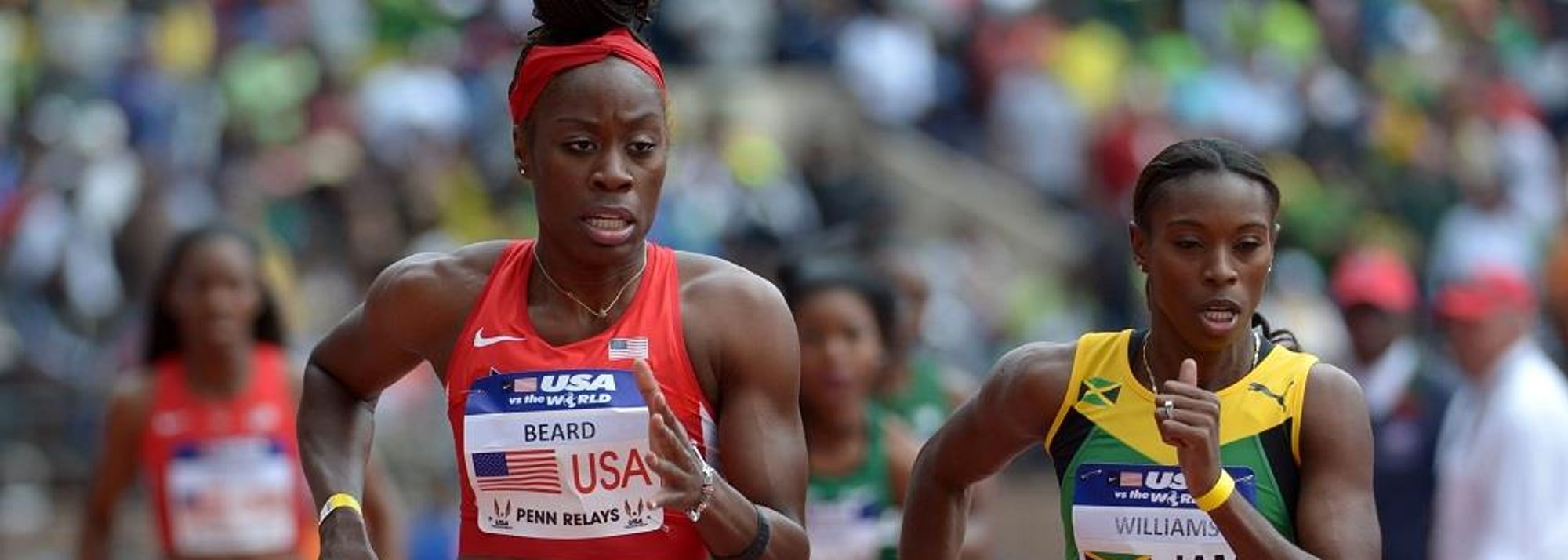Jessica Beard and Shericka Williams in action at the 2014 Penn Relays (© Kirby Lee)