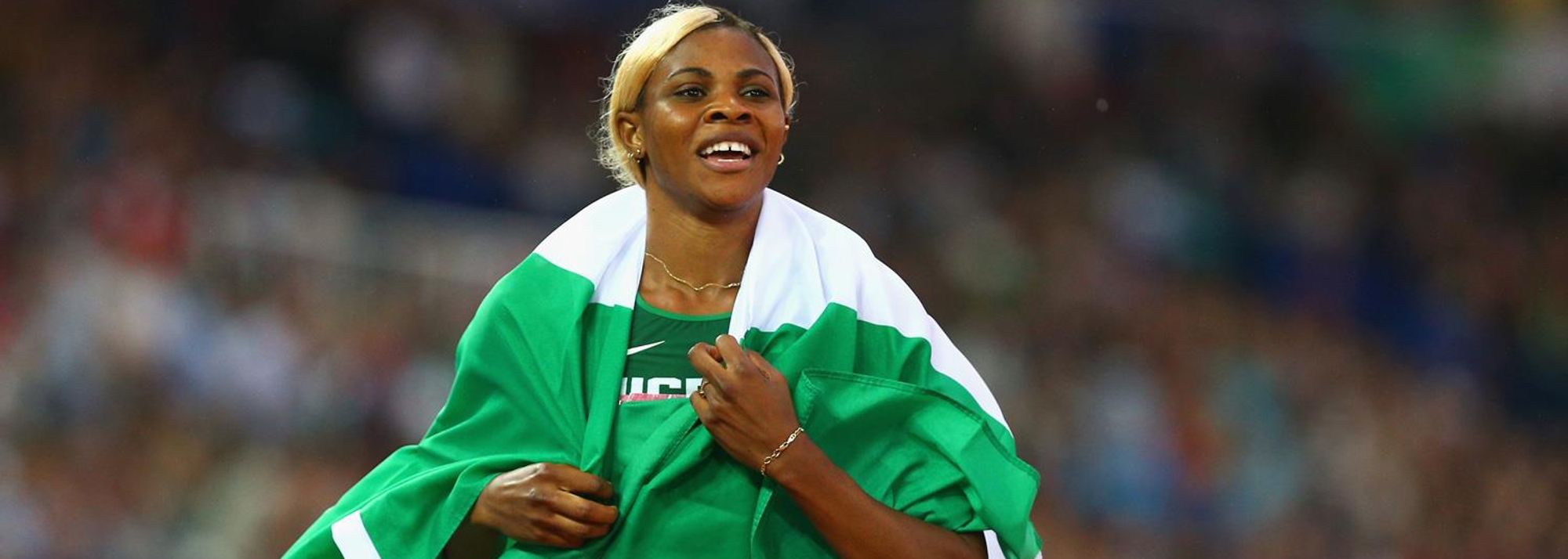 Nigeria's Blessing Okagbare celebrates after winning the 100m (© Getty Images)