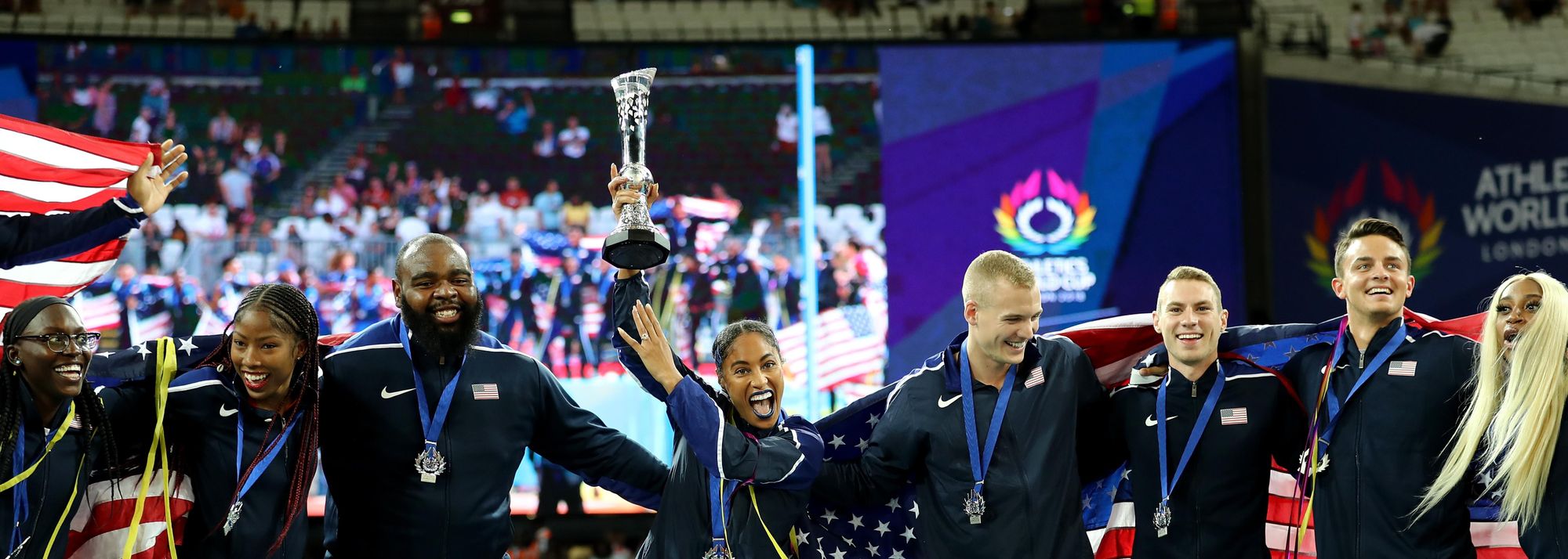 The US team celebrates their victory at the Athletics World Cup in London (© Getty Images)