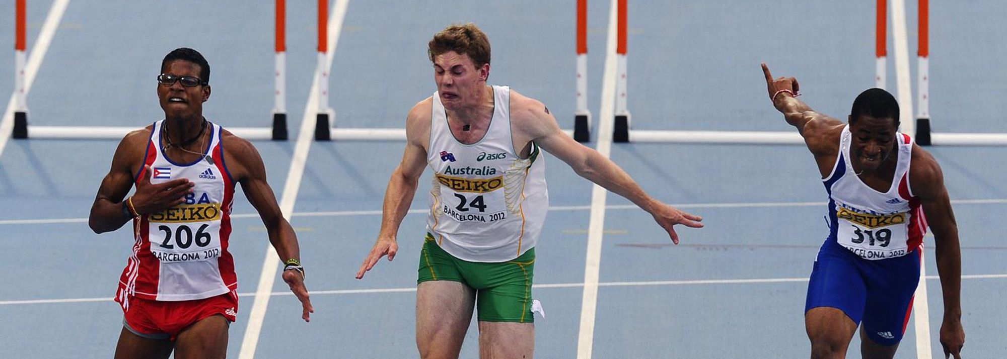 Yordan L. O'Farrill (L) of Cuba wins the Men's 110m Hurdles Final Nicholas Hough of Australia is second and French Wilhem Belocian third on the day three of the 14th IAAF World Junior Championships in Barcelona on 12 July 2012 (© Getty Images)