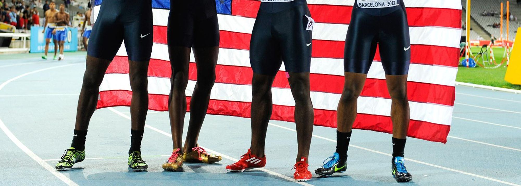 Tyreek Hill, Aldrich Bailey, Arthur Delaney and Aaron Ernest of United States pose after winning the gold medal on the Men's 4x100 metres Relay Final on the day five of the IAAF World Junior Championships in Barcelona on 14 July 2012 (© Getty Images)