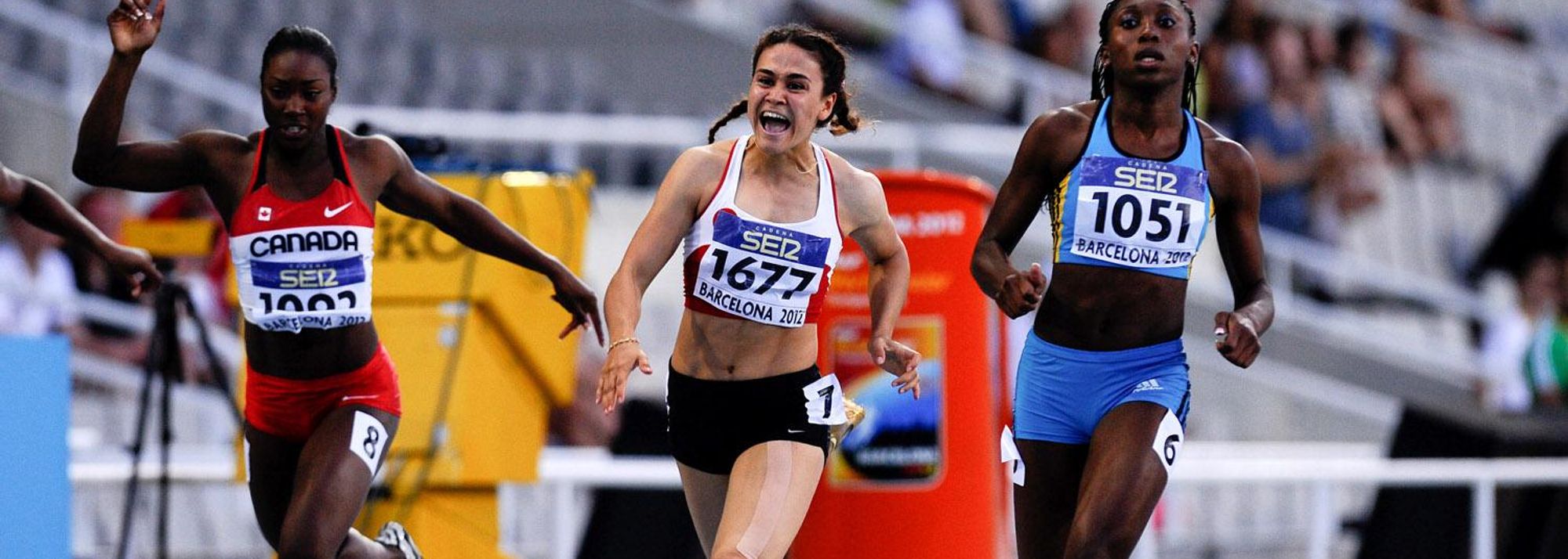 Anthonique Strachan (L) of Bahamas wins the Women's 100 metres Final on the day two of the 14th IAAF World Junior Championships in Barcelona 2012 (© Getty Images)