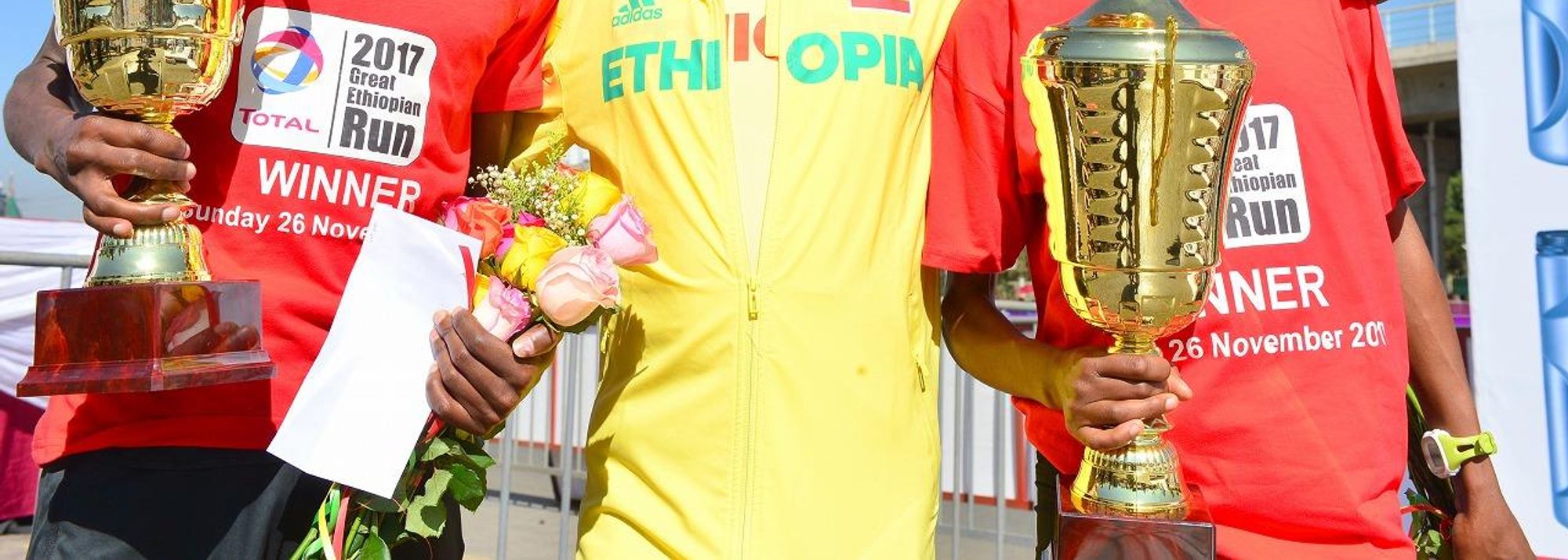 Great Ethiopian Run winners Selemon Berega and Zeyneba Yemer with Haile Gebrselassie (© Jiro Mochizuki)