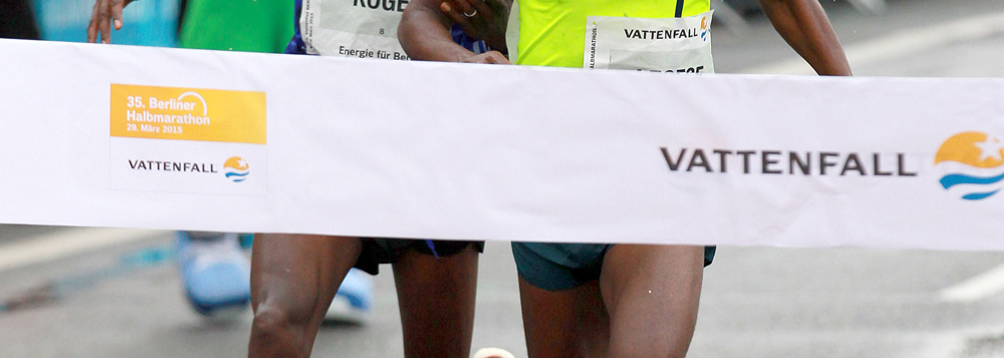 Berhanu Legese holds off David Kosgei to win the 2015 Berlin Half Marathon (© Victah Sailer / organisers)