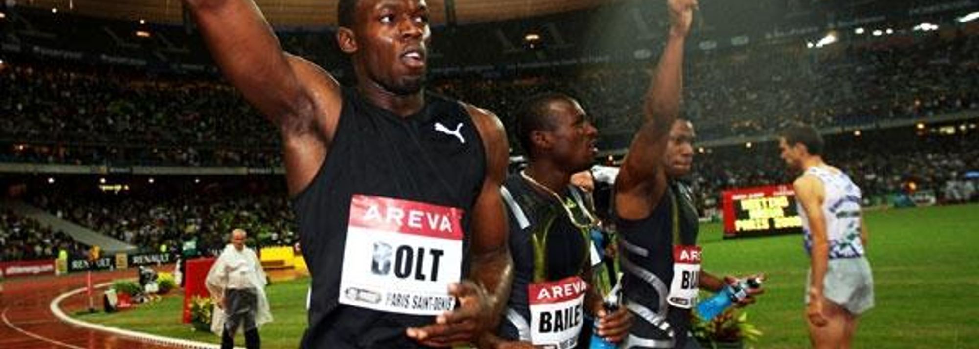 On a cool, extremely damp night in the Stade de France Usain Bolt defied the rain again to win the 100m in a meeting record of 9.79 sec this evening (17) at the Meeting Areva, the fourth of sixth meetings of the ÅF Golden League 2009.