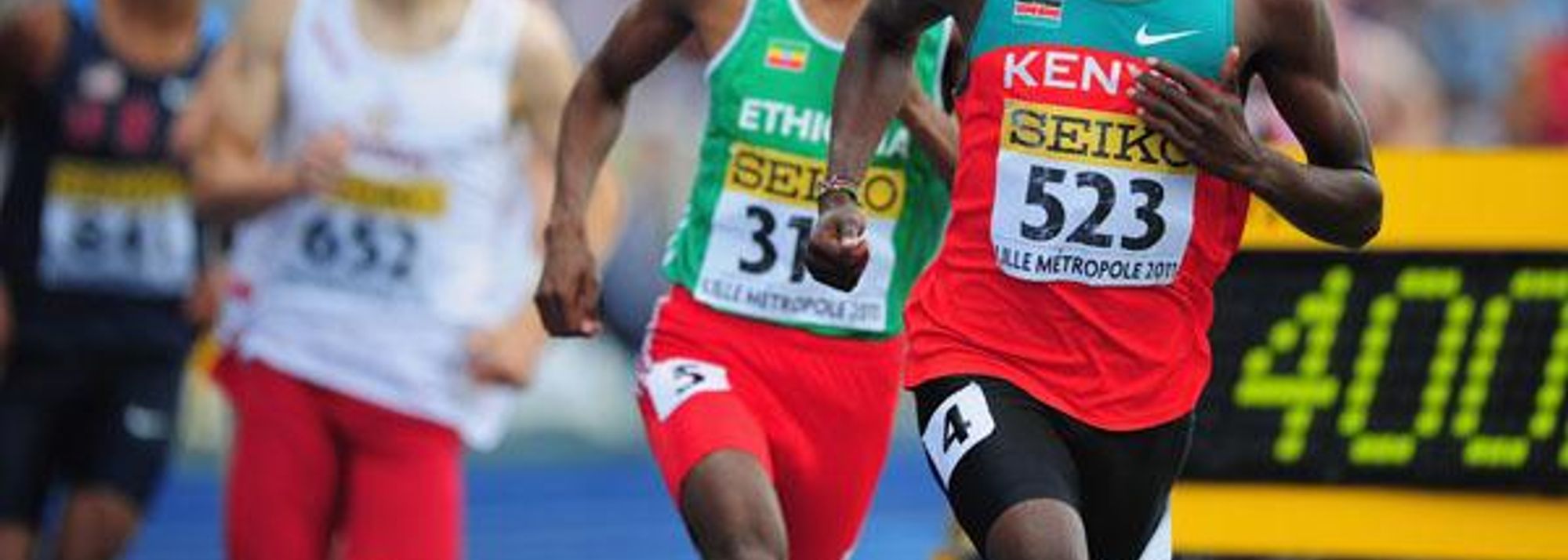 Leonard KIRWA KOSENCHA of Kenya (R) in action during the Boys 800 metres semi final - Day Two - WYC Lille 2011 (© Getty Images)