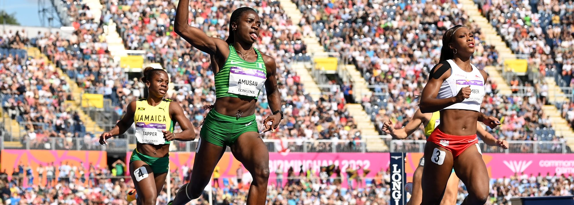 Tobi Amusan wins the 100m hurdles at the Commonwealth Games in Birmingham (© Getty Images)