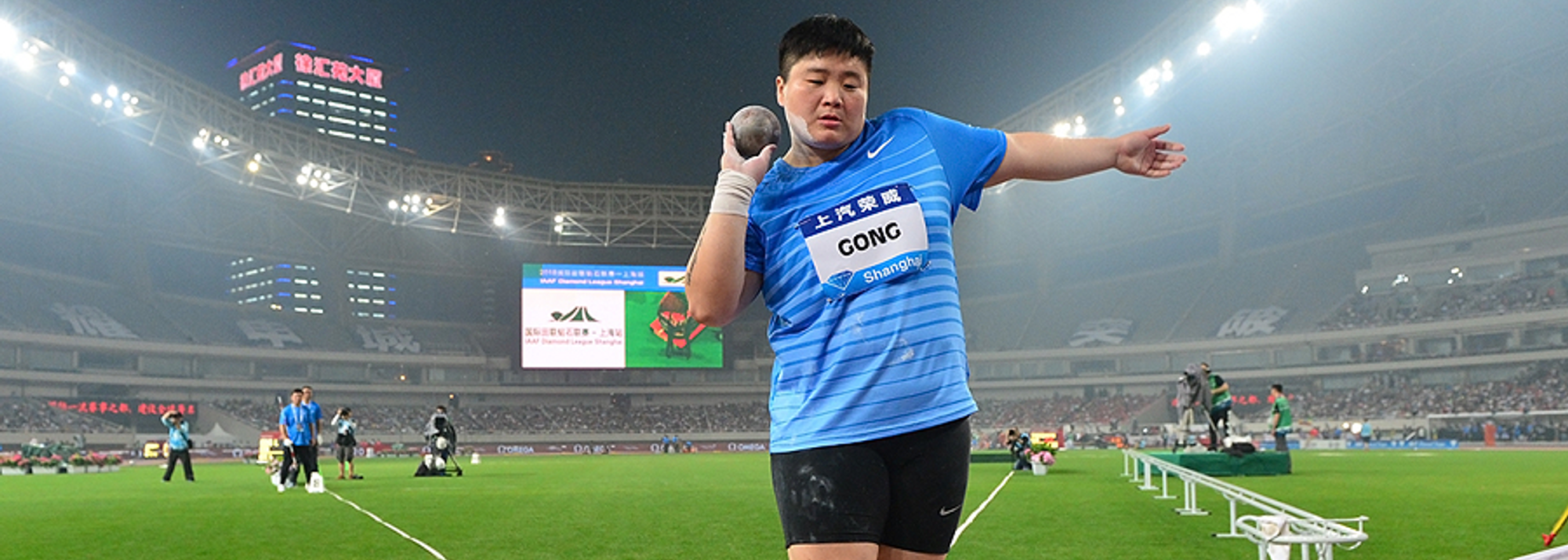 Gong Lijiao in the shot put at the IAAF Diamond League meeting in Shanghai (© Errol Anderson)