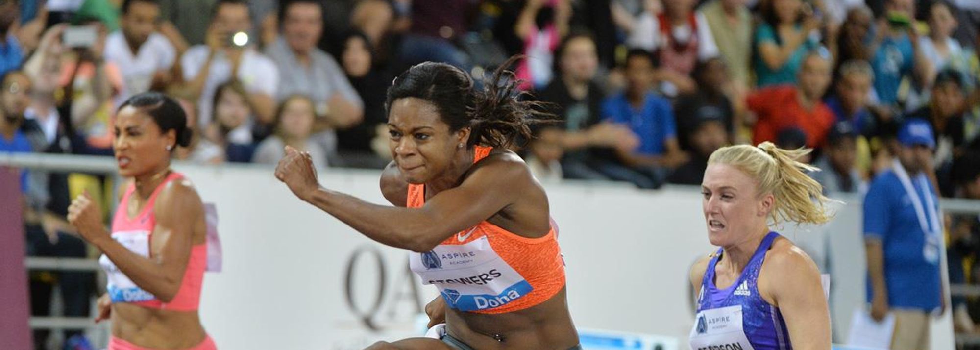 Jasmin Stowers on her way to winning the 100m hurdles in 12.35 at the IAAF Diamond League meeting in Doha (© DECA Text & Bild)