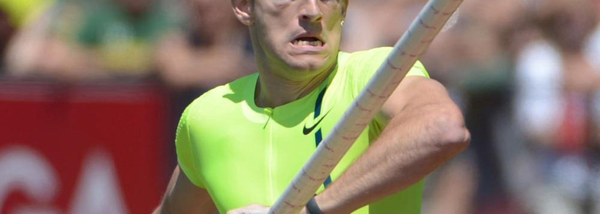 Renaud Lavillenie on his way to winning the pole vault at the IAAF Diamond League meeting in Eugene (© Kirby Lee)