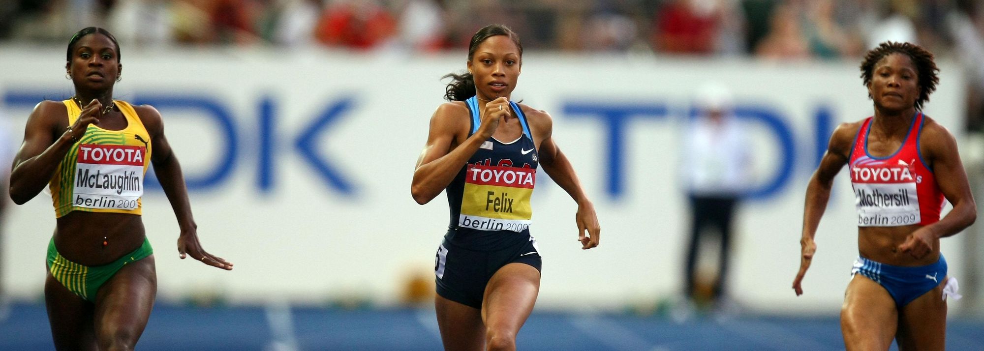 (L-R) Jamaica's Anneisha Mclaughlin, USA's Allyson Felix and the Cayman Islands' Cydonie Mothersille in the second of the women's 200m semi-finals in Berlin (© Getty Images)