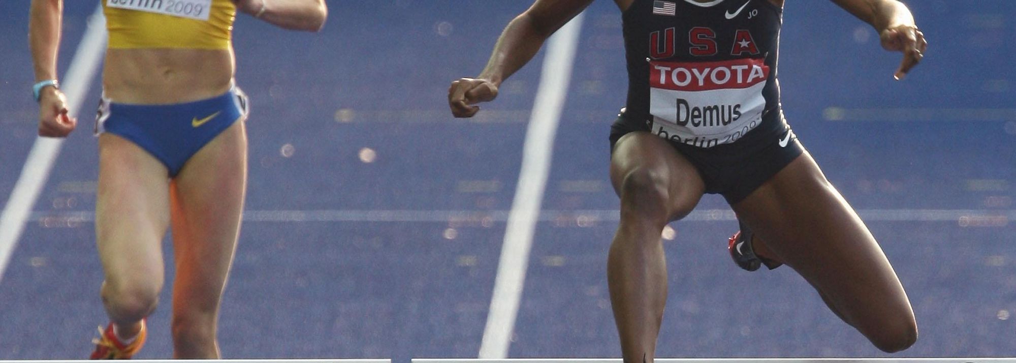 (L-R) Anastasiya Rabchenyuk of Ukraine and World Leader Lashinda Demus of the USA in action during the women's 400m hurdles heats (© Getty Images)
