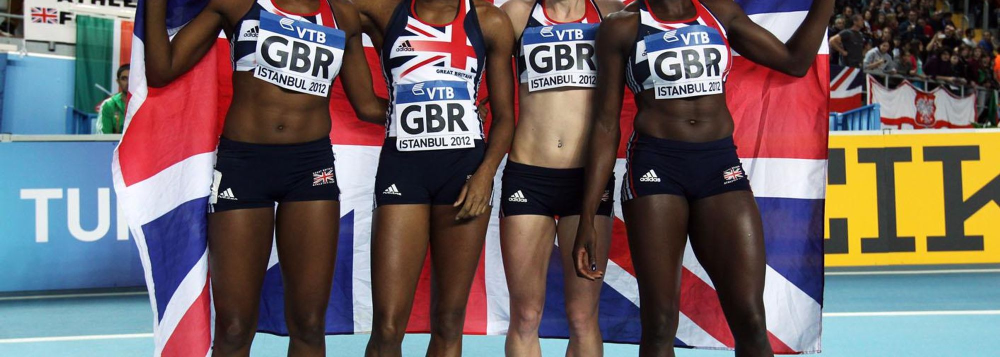 (L-R) Perri Shakes-Drayton, Shana Cox, Nicola Sanders and Christine Ohuruogu of Great Britain celebrate as they win gold in the Women’s 4x400 Metres Final during day three - WIC Istanbul (© Getty Images)