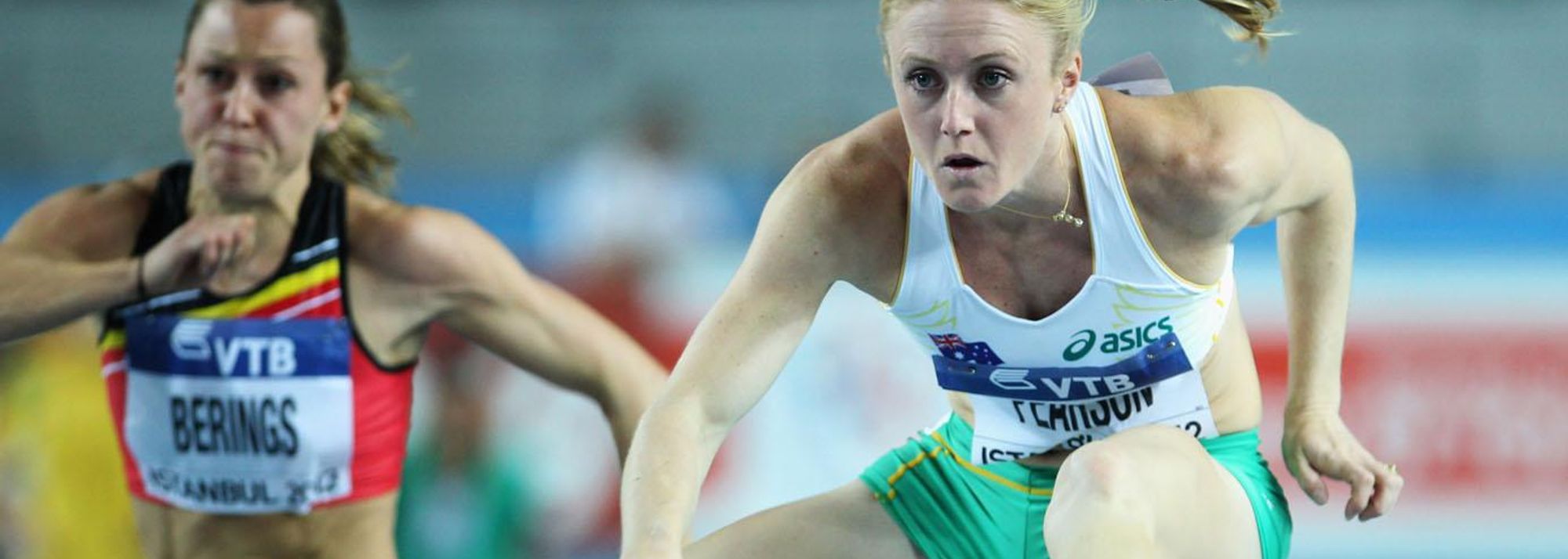 Sally Pearson of Australia (R) and Eline Berings of Belgium compete in the Women's 60 Metres Hurdles first round during day one - WIC Istanbul (© Getty Images)