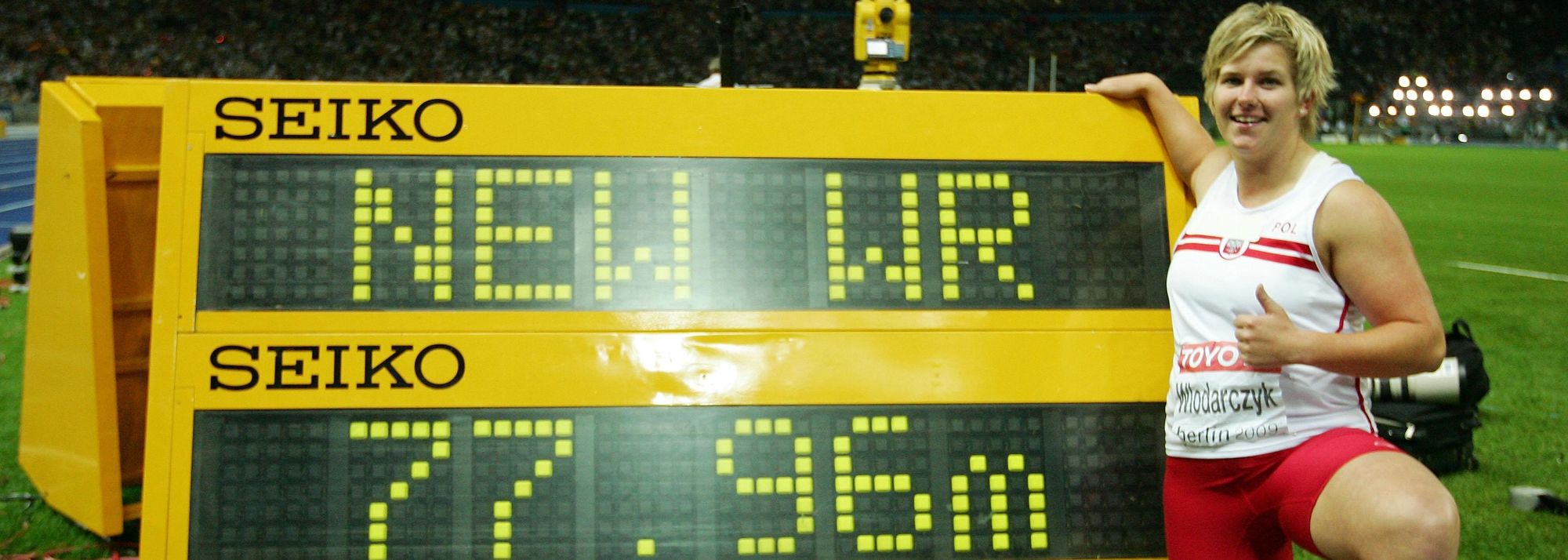 Throwing in the second round, the 24-year-old Pole broke the previous record of 77.80m set by Russian Tatyana Lysenko of Russia in 2006. It was the third World record set during the 12th IAAF World Championships in Athletics.