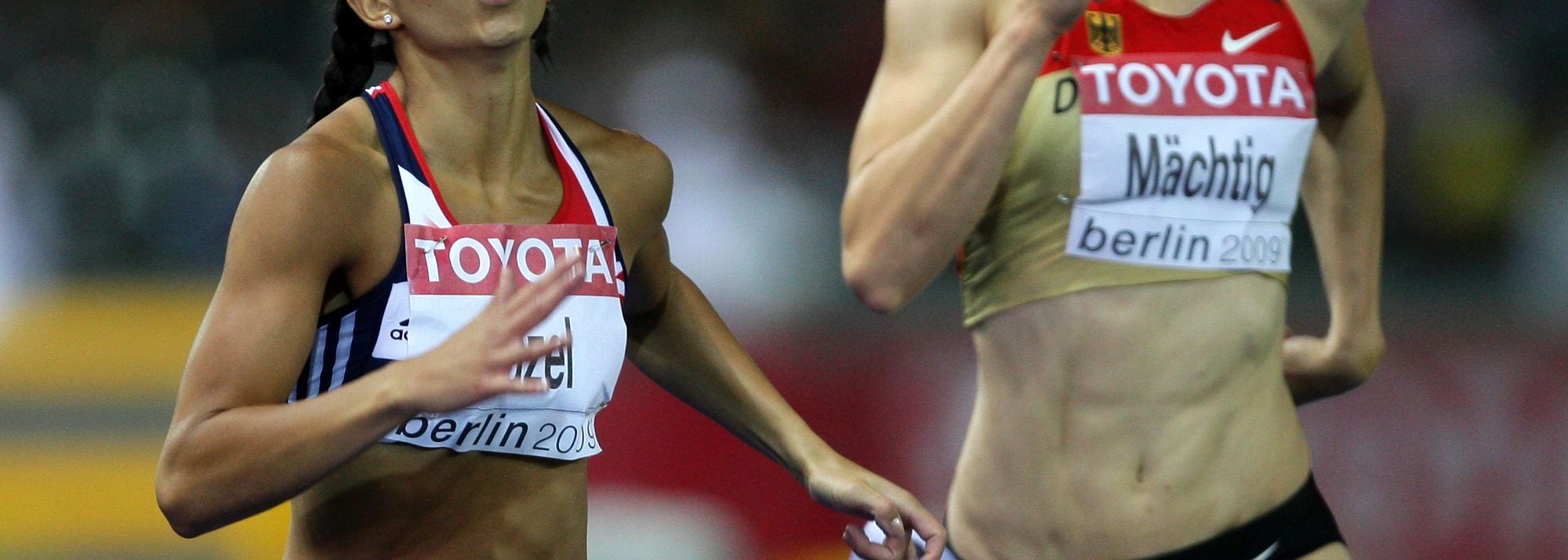 Britain's Louise Hazel and Julia Mächtig of Germany at the end of day one in the women's Heptathlon 200m (© Getty Images)