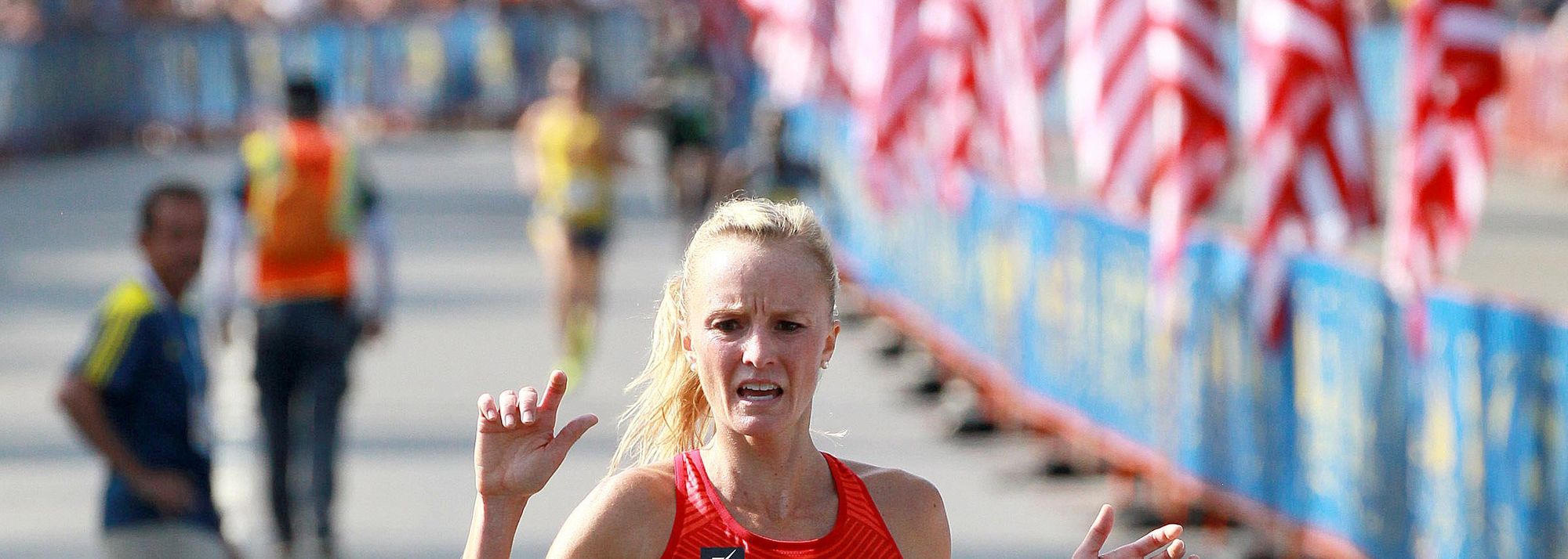 Shalane Flanagan en route to a 30:52 area 10k record in Boston (© Victah Sailer)