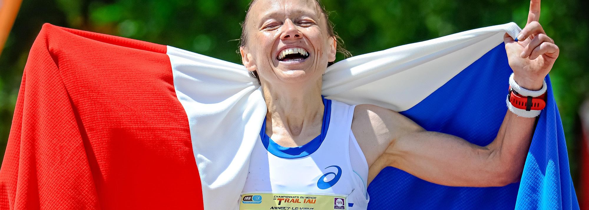 Nathalie Mauclair after winning at the 2015 IAU Trail World Championships (© French athletics federation / organisers)
