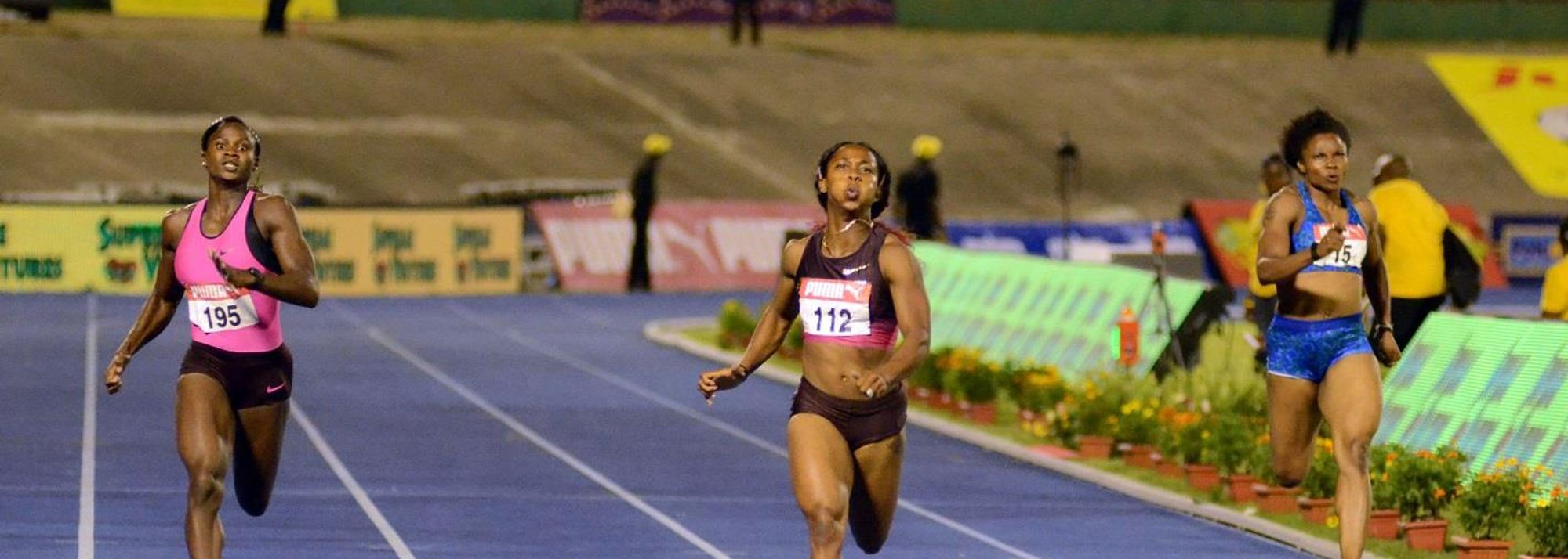 Shelly-Ann Fraser-Pryce (right) winning the 200m at the 2013 Jamaican Championships (© Anthony Foster)