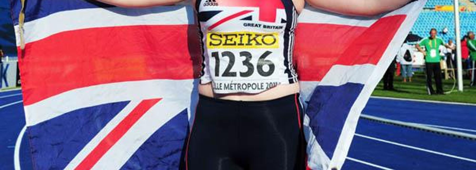 Louisa James of Great Britain celebrates winning the Girls' Hammer in Lille (© Getty Images)