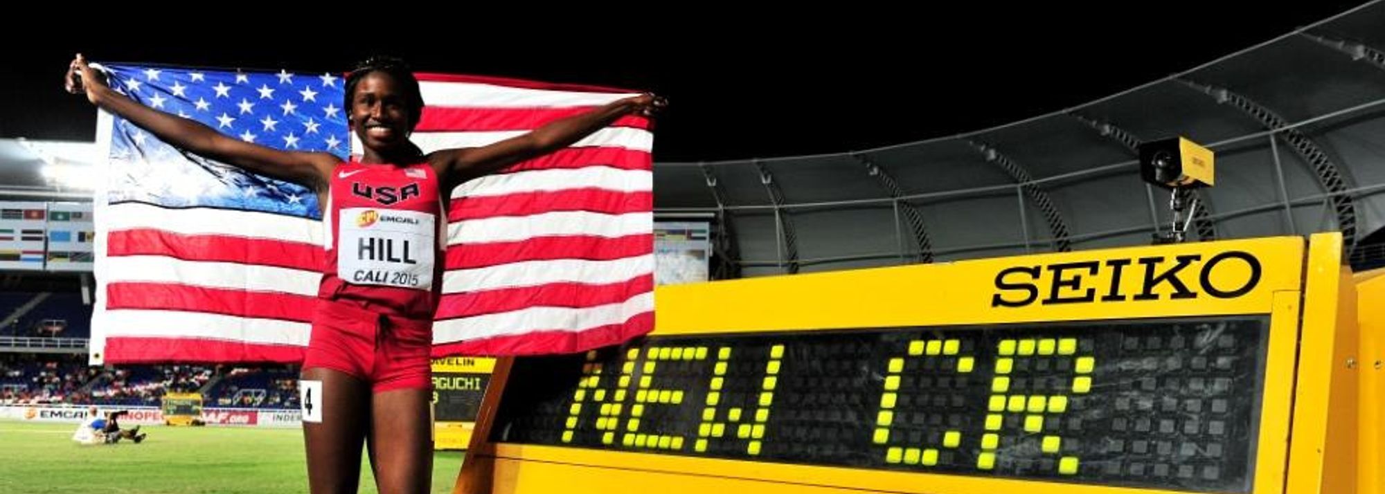 Candace Hill after winning the girls' 100m at the IAAF World Youth Championships, Cali 2015 (© Getty Images)