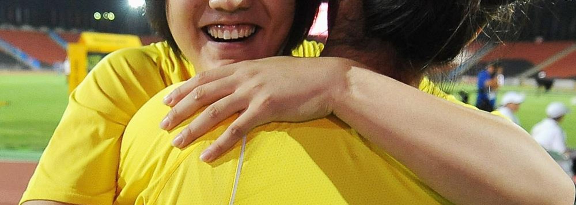 Xie Yuchen celebrates her victory in the Discus at the 2013 World Youth Championships in Donetsk (© Getty Images)