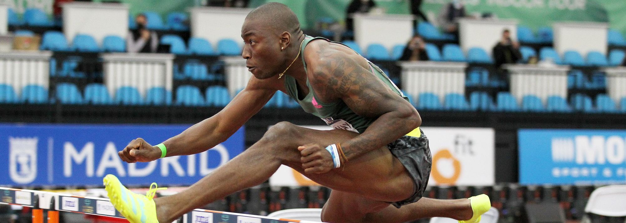 Grant Holloway in action in the 60m hurdles at the World Athletics Indoor Tour Gold meeting in Madrid (© Jean-Pierre Durand)