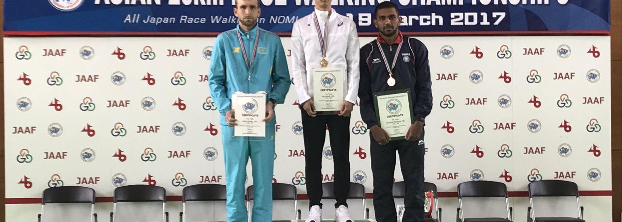 Men's podium at the 2017 Asian 20km Race Walking Championships, from left: runner-up Georgiy Sheiko, winner Kim Hyun-Sub and bronze medallist Irfan Kolothum Thodi (© Rahul Pawar (organisers))