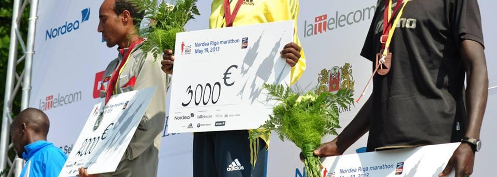 Duncan Koech (centre) with his winner's cheque after the Nordea Riga Marathon (© organisers)