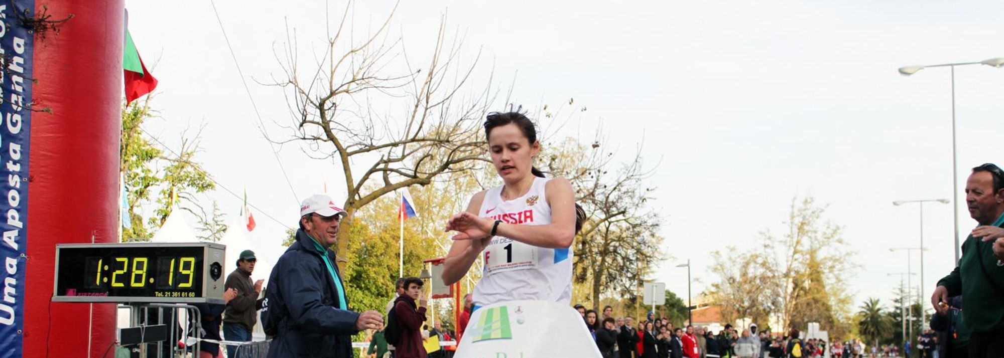 Elena Lashmanova stops the clock in Rio Maior to win the women's 20km race walk (© Rui Correia/Samuel Valerio)